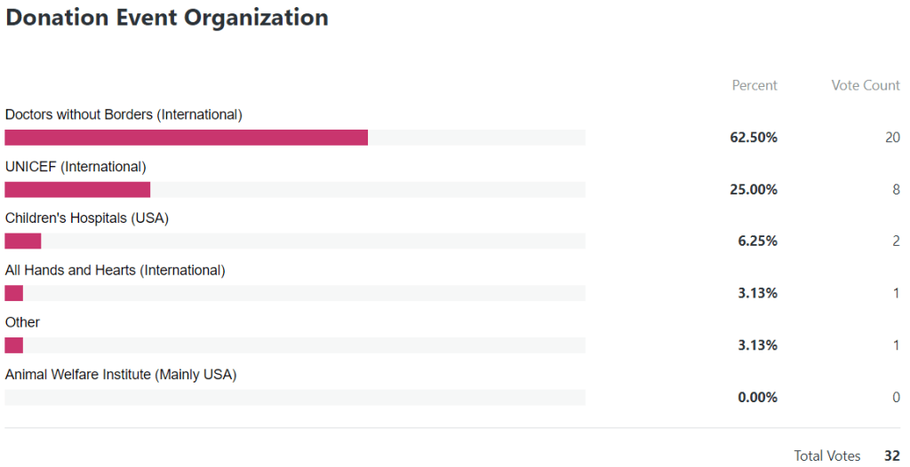Here’s the results for the donation event poll! (All repeat IP address were filtered out!)